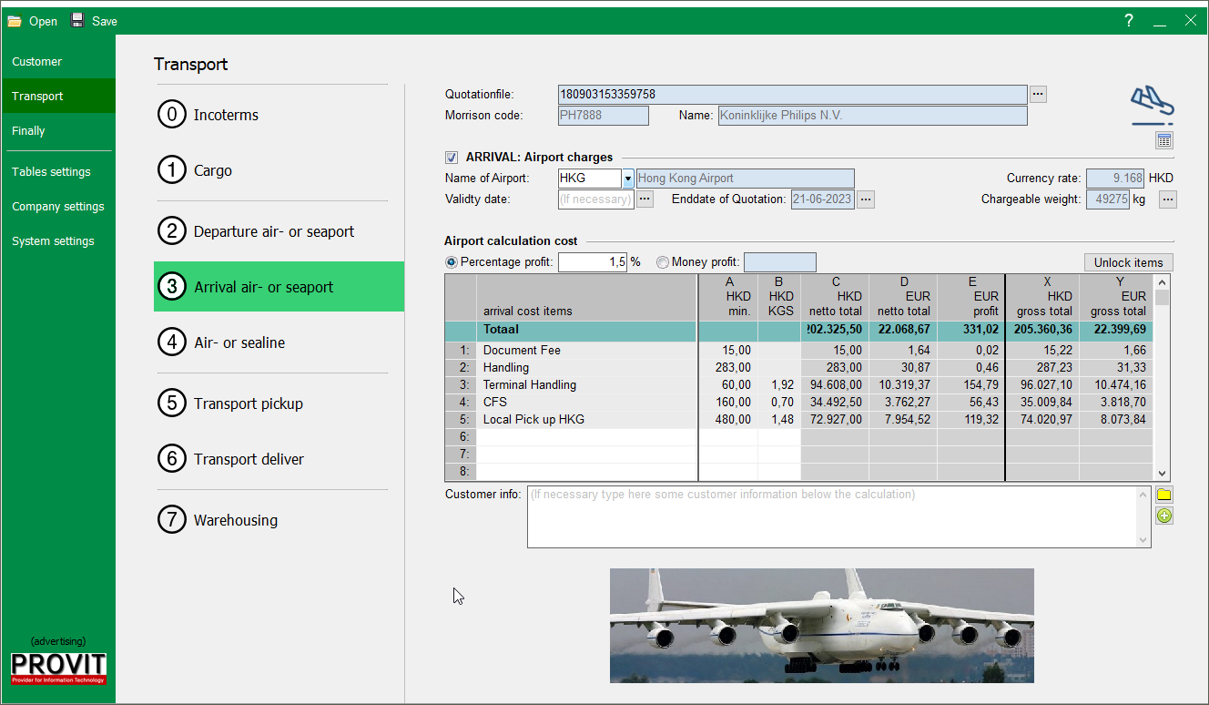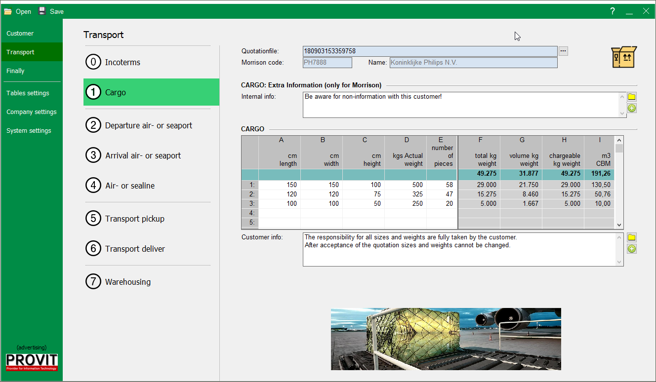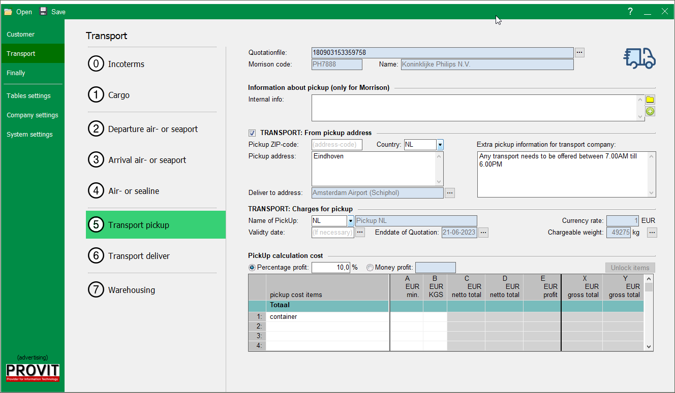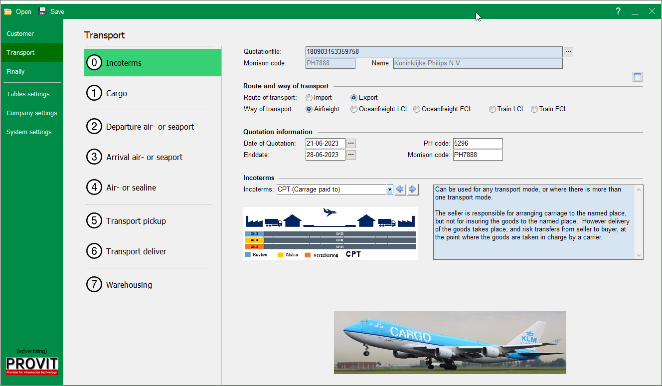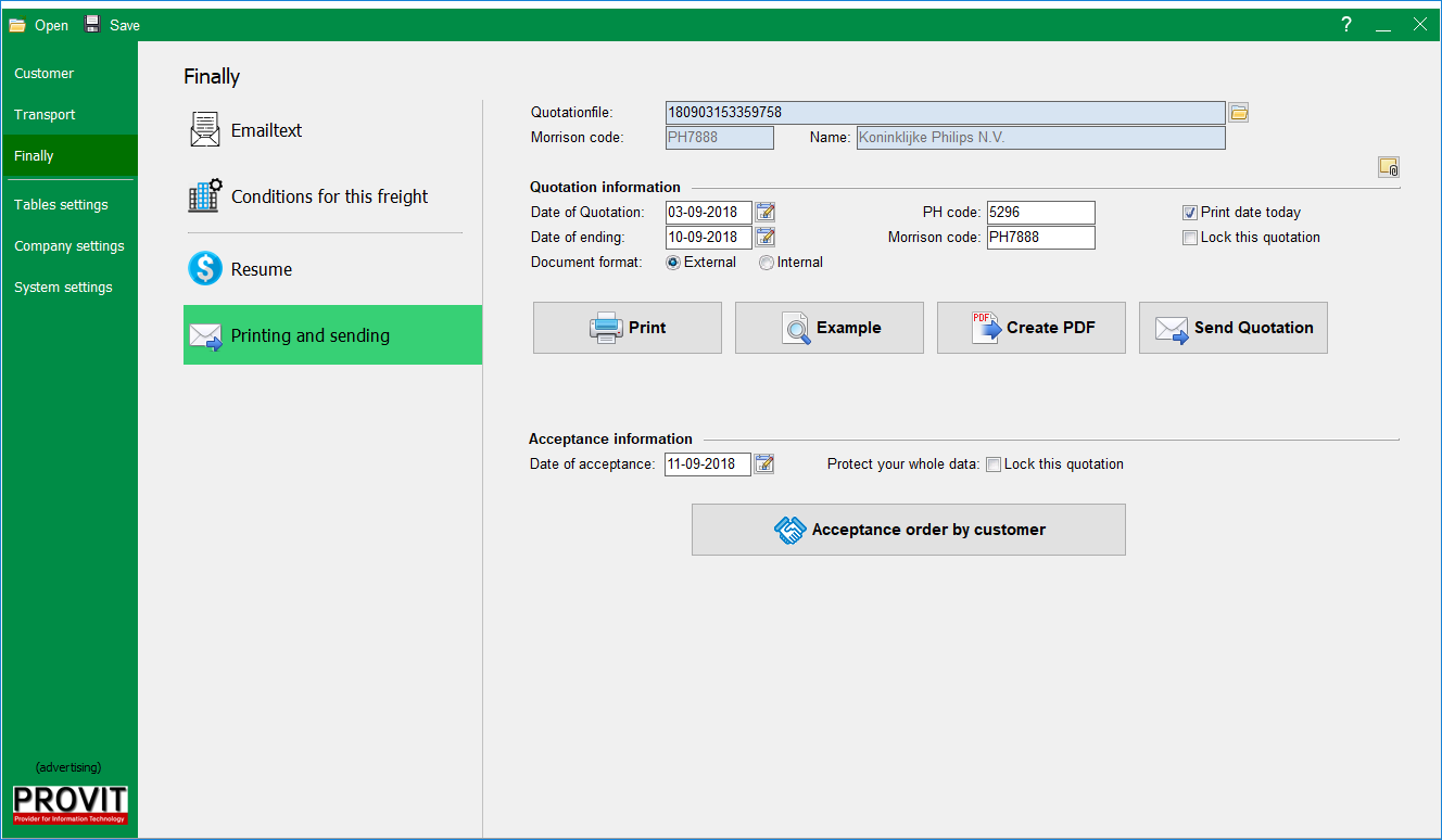 Deze tool is ontwikkeld in nauwe samenwerking met een aantal logistieke bedrijven. Vanuit de menu opbouw volgt de gebruiker logische stappen in het logistieke proces om te komen tot een offerte. De output in PDF is gestandaardiseerd op te stellen met behulp van in het systeem te kiezen teksten. Diverse tabellen ondersteunen bij het consistent en eenvoudig opstellen van de offerte. Informatie is aan elkaar gerelateerd waardoor de foutkans beduidend lager is vergeleken met het werken in een spreadsheet.